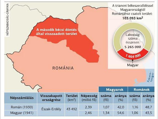 1938-ban az első bécsi döntésnek köszönhetően visszatért Magyarországhoz a Felvidék 11 ezer négyzetkilométeres, 80 százalékban magyarok lakta déli sávja. Két évvel később pedig a második bécsi döntésnek köszönhetően hazatért a Partium és Erdély északi része, valamint a Székelyföld, 43.492 négyzetkilométer területtel, és összesen 2,46 millió lakossal, ebből 1,344 millió (54,6 százalék) volt magyar, 1,068 millió román (43,5 százalék) és 47 300 fő (1,9 százalék) német.