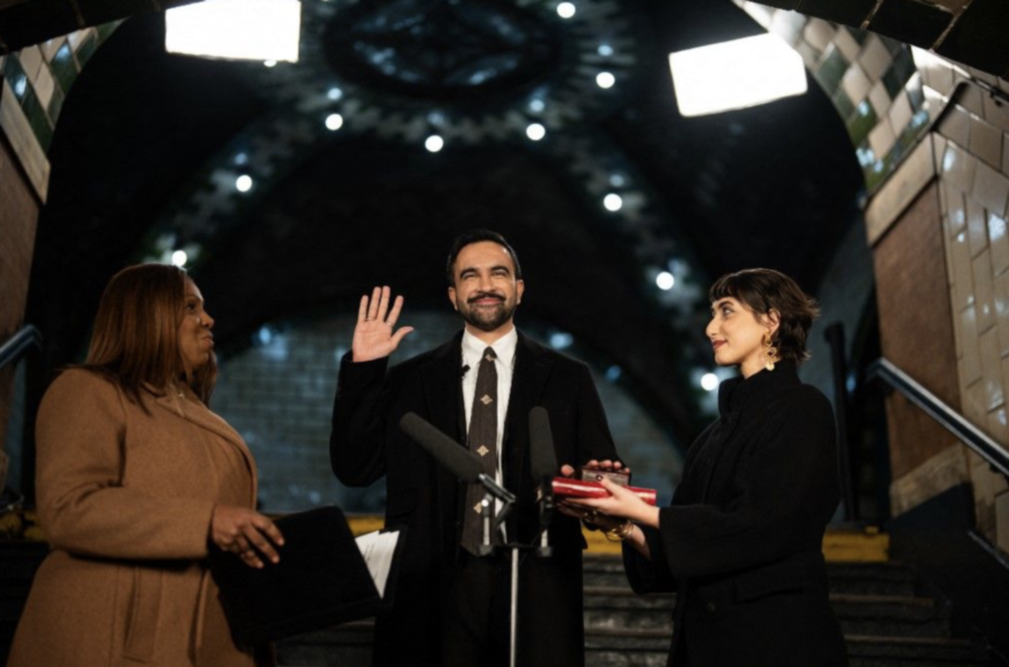 A polgármesteri hivatal értelmezése szerint az éjféli, föld alatti ceremónia azt az üzenetet hordozza, hogy Mamdani a várost működtető hétköznapi dolgozók oldalán áll. Az eseményen megjelent a leköszönő polgármester, Eric Adams is, noha korábban még azt nyilatkozta, nem vesz részt az eskütételen. Végül azzal indokolta jelenlétét, hogy személyesen kívánja jelezni a hatalom békés átadását – írja az Origo.